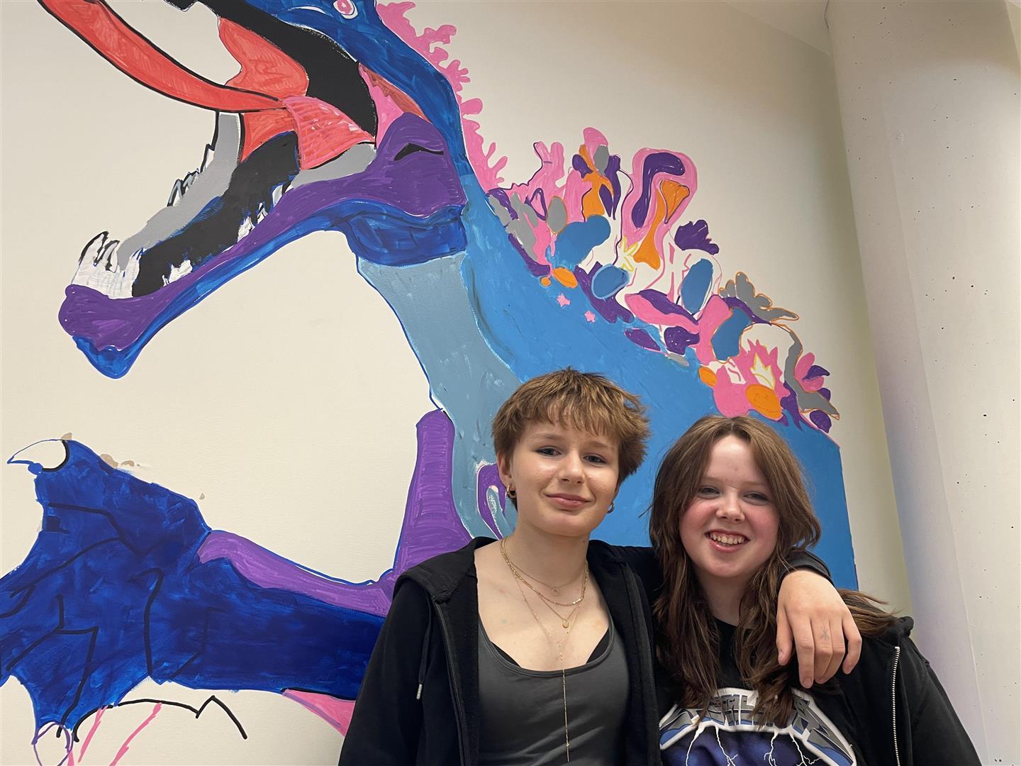Elisabeth og Mia Kristin fikk være kreative på bibliotekets vegger